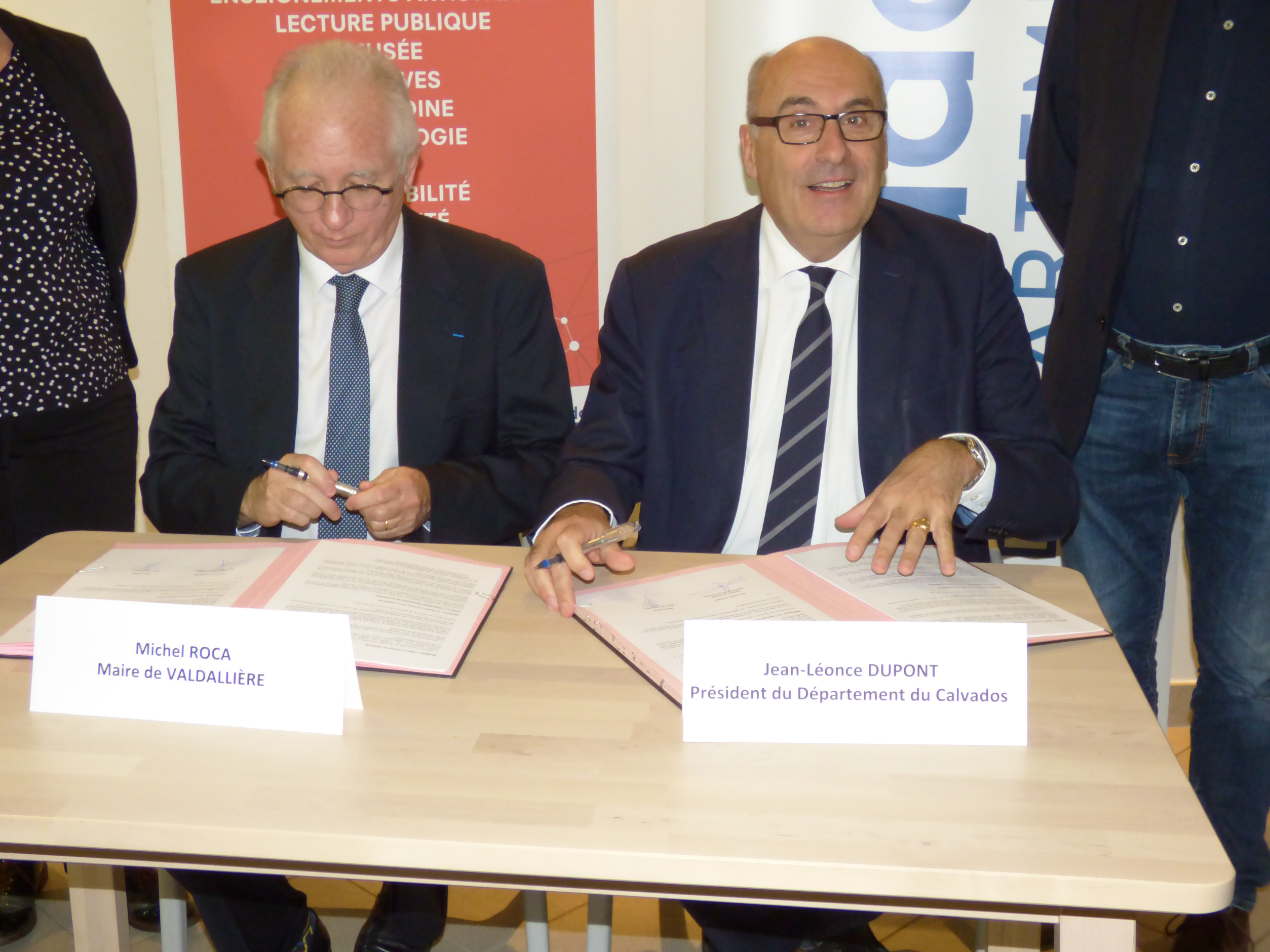 Mercredi 12 février 2020, à la médiathèque de Vassy, Monsieur Jean-Léonce Dupont, Président du Département du Calvados et Monsieur Michel Roca, Maire de Valdallière et Vice-Président du Département du Calvados, ont signé le contrat de développement culturel entre le Département du Calvados et la commune nouvelle de Valdallière.