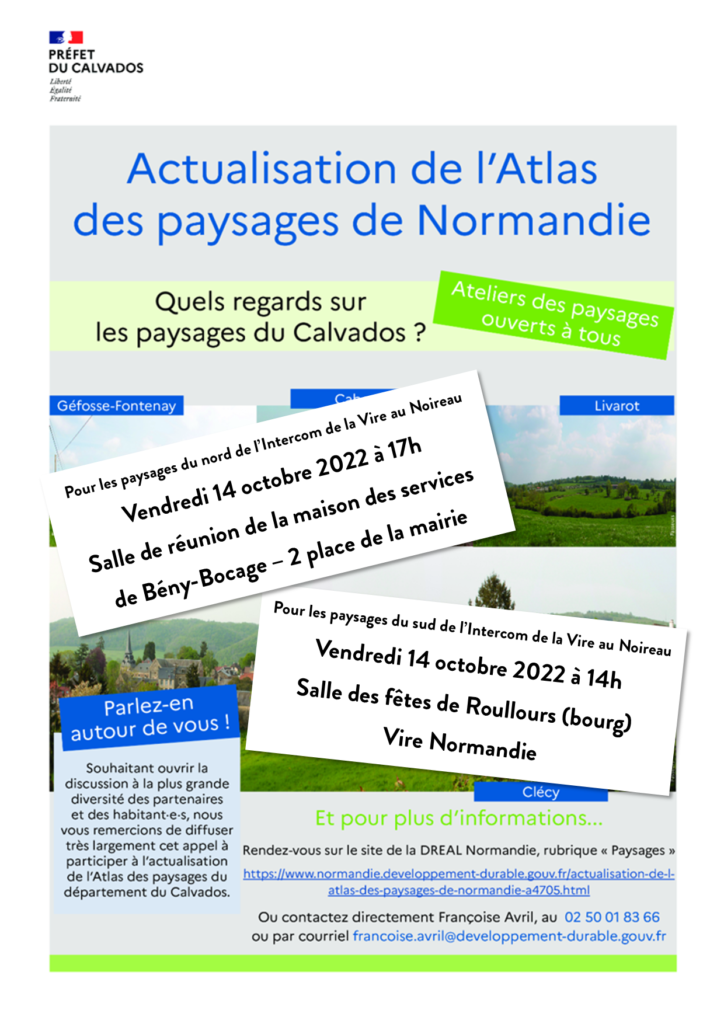 Dans le cadre de la mission d’actualisation de l’Atlas des Paysages de Normandie sur le département du Calvados, la DREAL Normandie vous invite à participer aux ateliers des Paysages du Calvados.