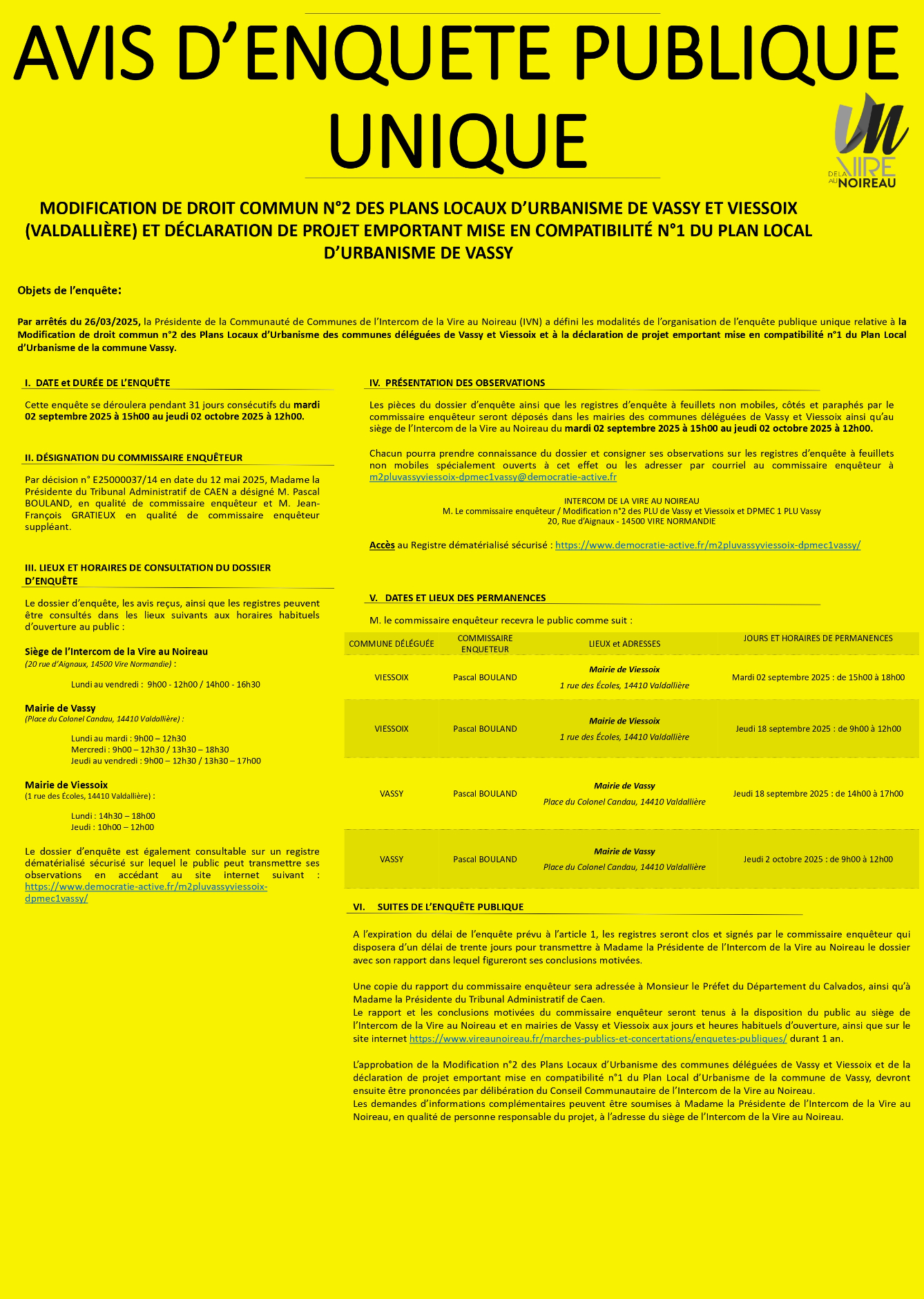 Par arrêtés du 26 mars 2025, l’Intercom de la Vire au Noireau a engagé l’enquête publique unique relative à la Modification n°2 des PLU des communes délégéues de Vassy et Viessoix et à la déclaration de projet emportant mise en compatibilité n°1 du PLU de la commune de Vassy qui se déroulera du mardi 02 septembre 2025 à 15h00 au jeudi 02 octobre 2025 à 12h00.