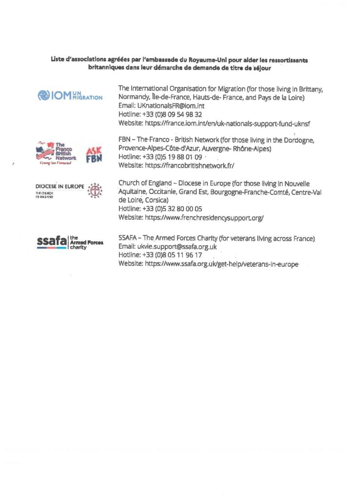 Des associations de résidents britanniques en France, agréées par l’ambassade du Royaume-Uni sont en mesure d’apporter une aide pratique afin d’accompagner les demandeurs dans cette démarche administrative.