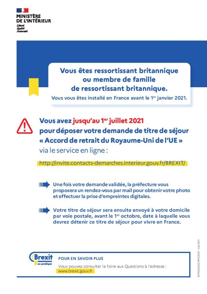 Dans le cadre de l’application de l’accord de retrait du Royaume-Uni de l’Union européenne, les ressortissants britanniques et les ressortissants de pays tiers membres de leur famille résidant en France avant le 1er janvier 2021 et continuant à y résider devront détenir un titre de séjour afin de séjourner régulièrement sur le territoire français.