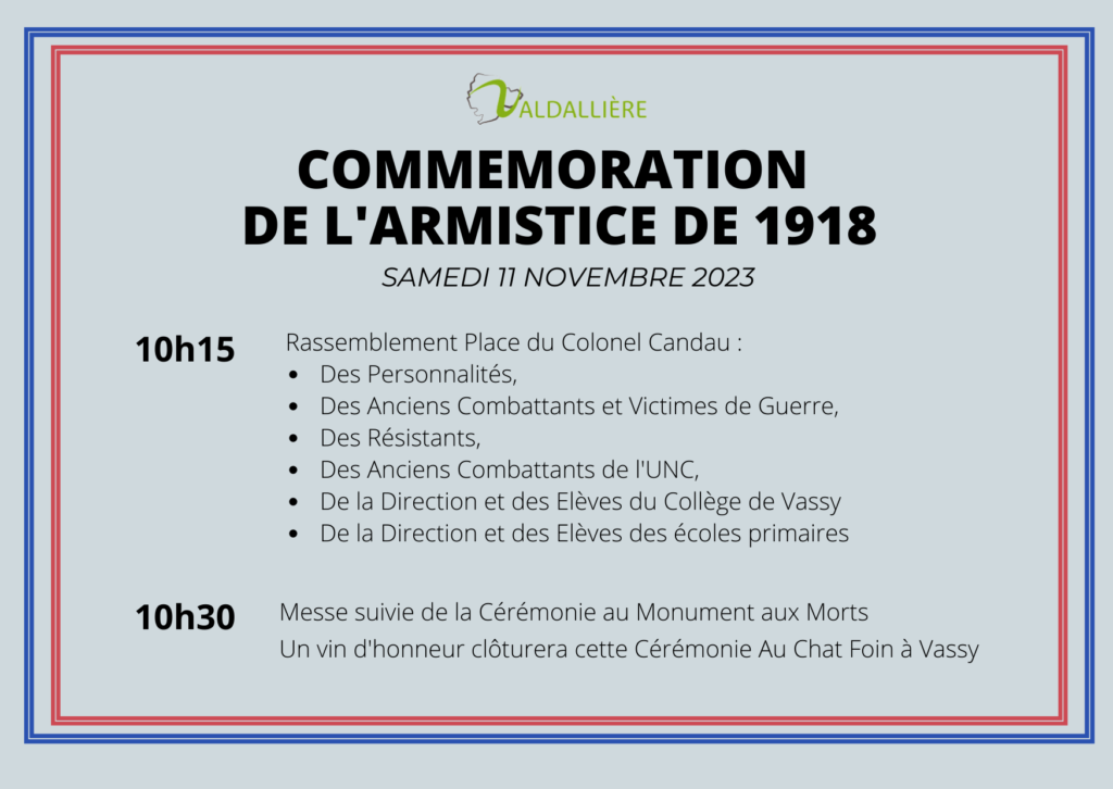 La cérémonie commémorative de l’armistice du 11 novembre 1918 aura lieu à Vassy, ce samedi 11 novembre 2023.