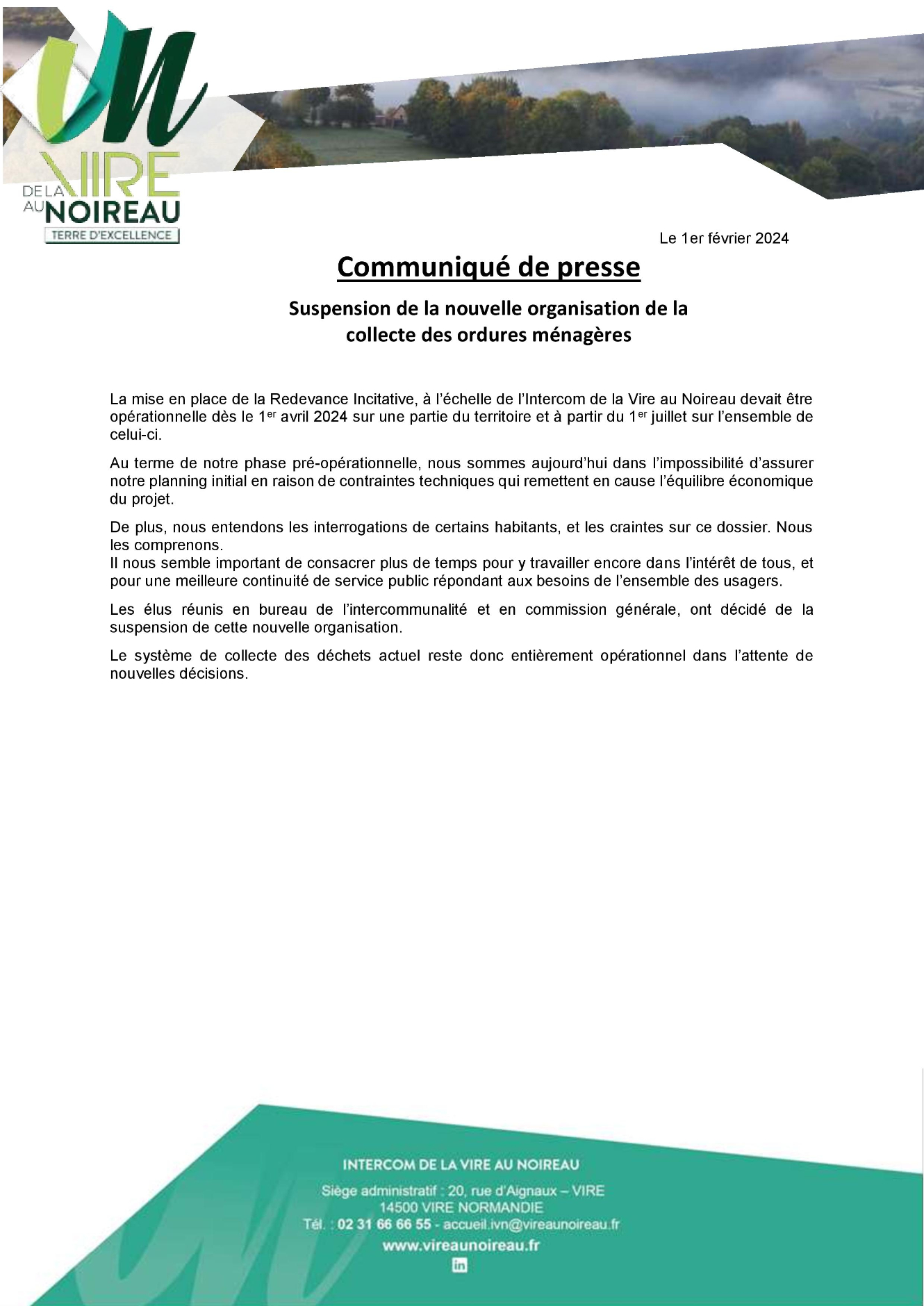 L’intercom de la Vire au Noireau a publié le 1er février 2024, un communiqué de presse relatif à la suspension de la nouvelle organisation de la collecte des ordures ménagères sur le territoire.