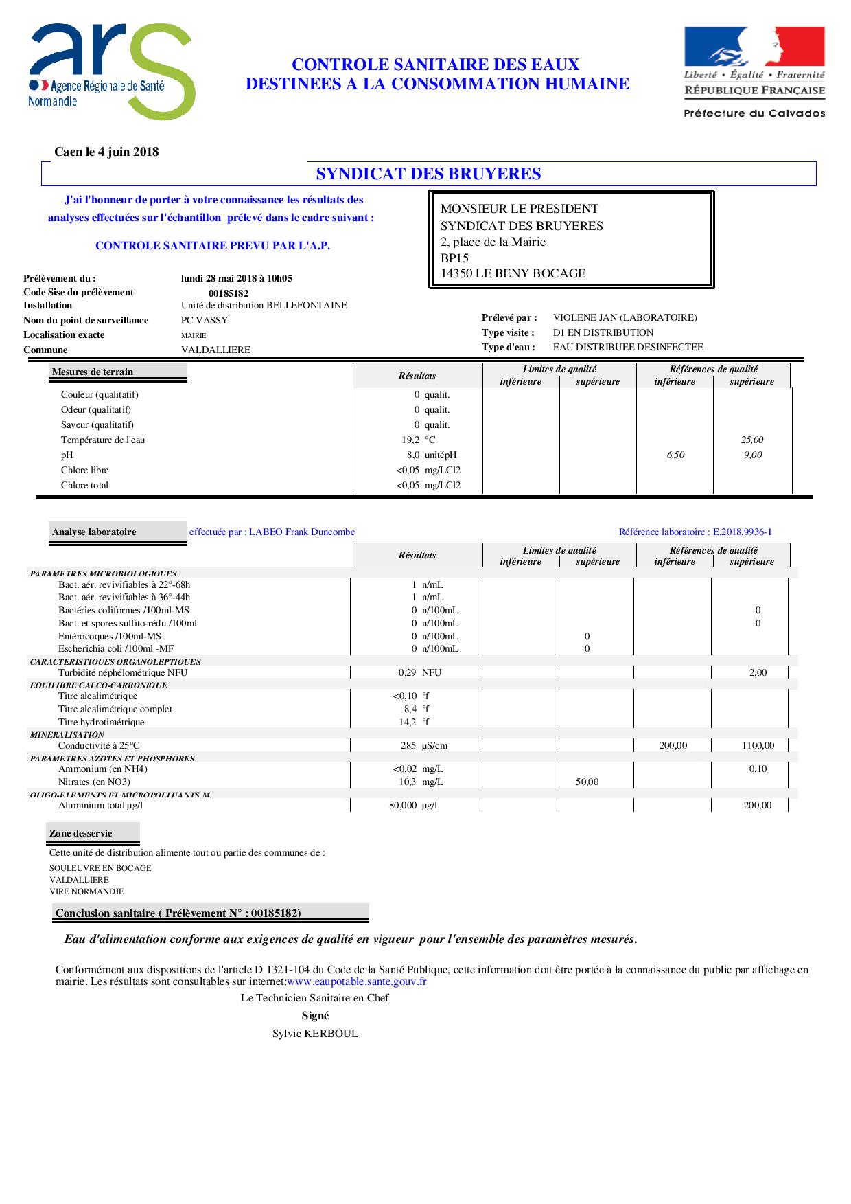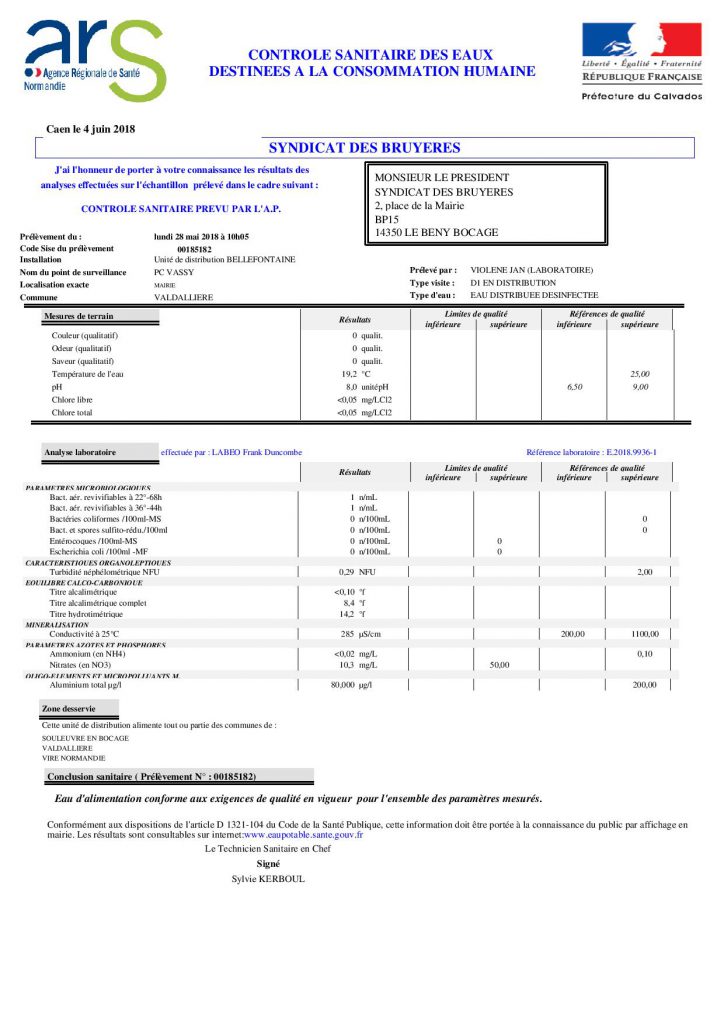 Contrôle sanitaire des eaux destinées à la consommation Humaine du 4 juin 2018