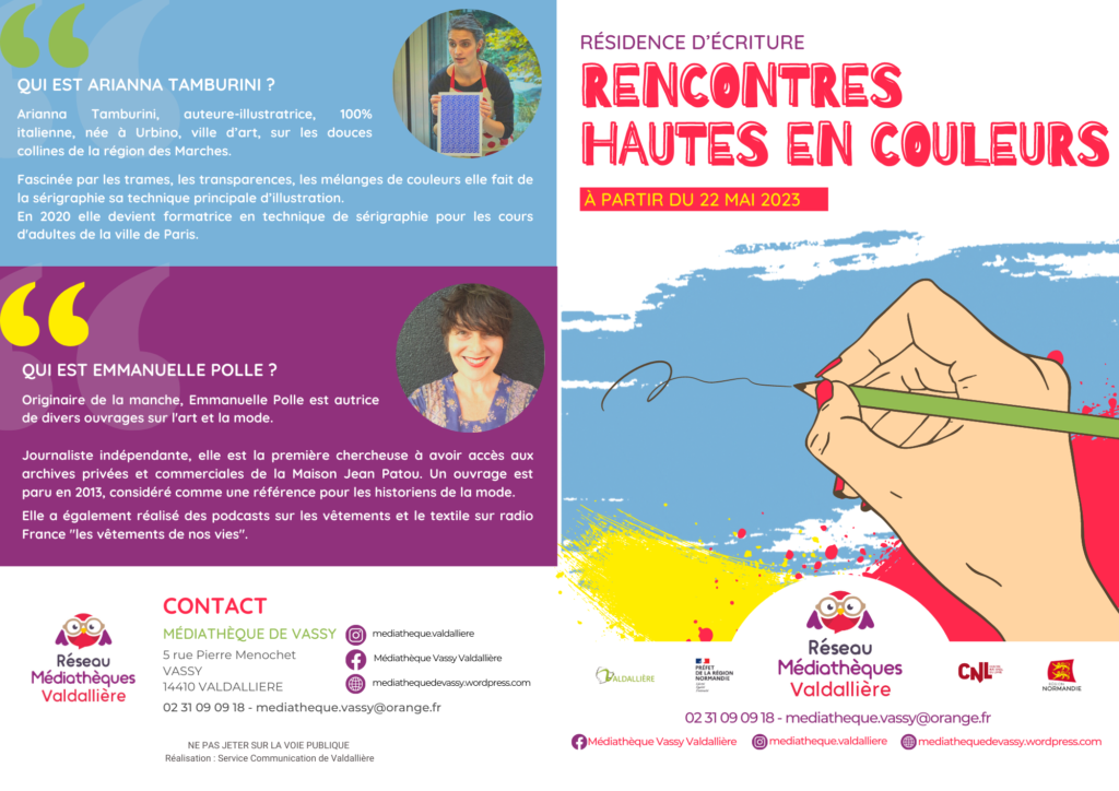 - Une soirée regard croisés est proposée pour les plus âgés souhaitant en savoir plus sur le parcours de l’autrice et de son invité Emmanuelle Polle. La soirée débutera par un petit repas à partir de 18h30, chacun ramène de quoi grignoter. Elle se poursuivra par un moment d’échanges et de questions sur la carrière des autrices, leurs passions pour le textile et les couleurs. Aucune inscription n’est nécessaire.