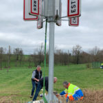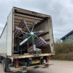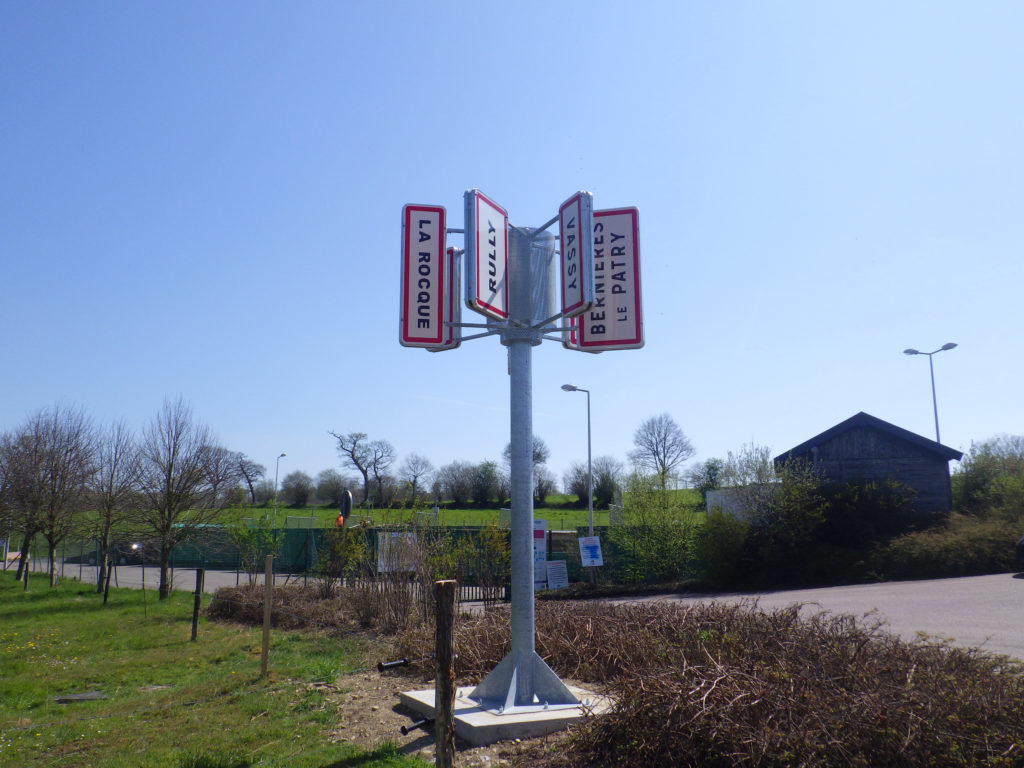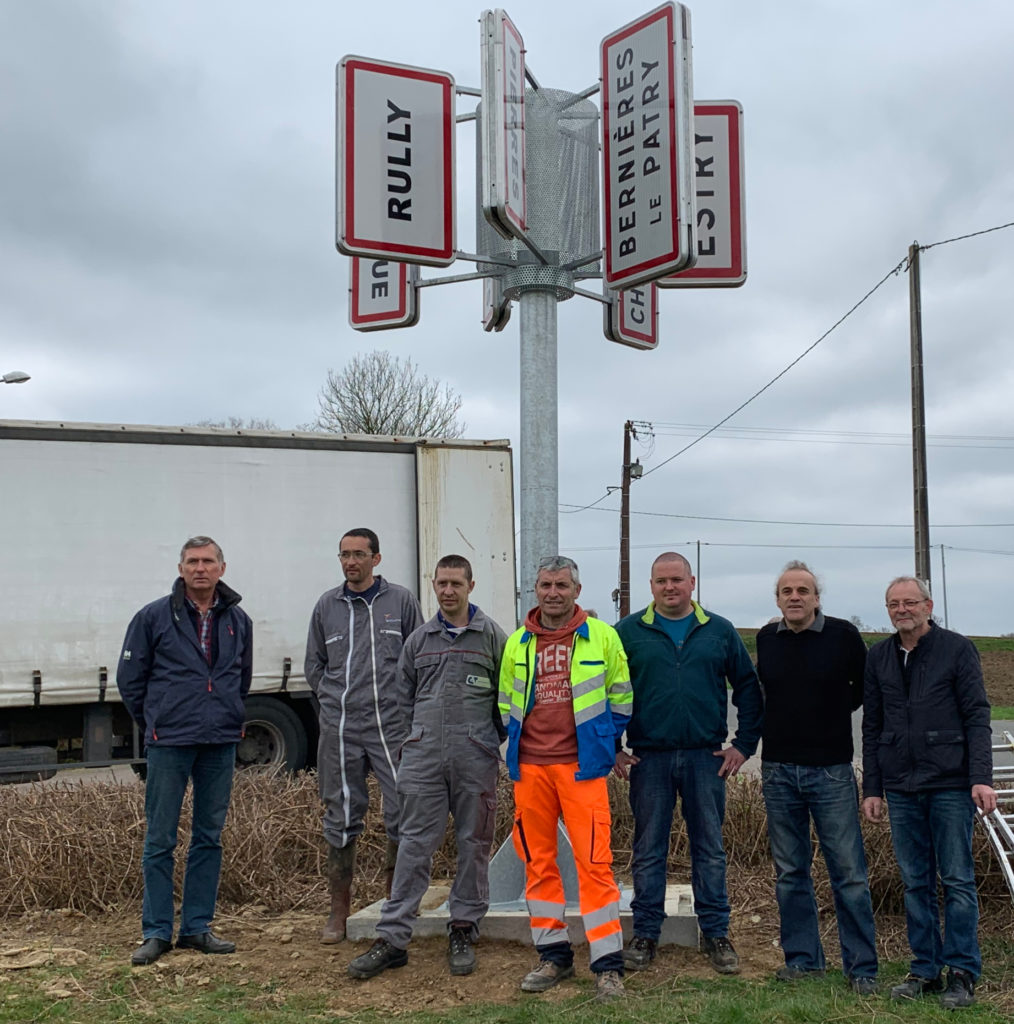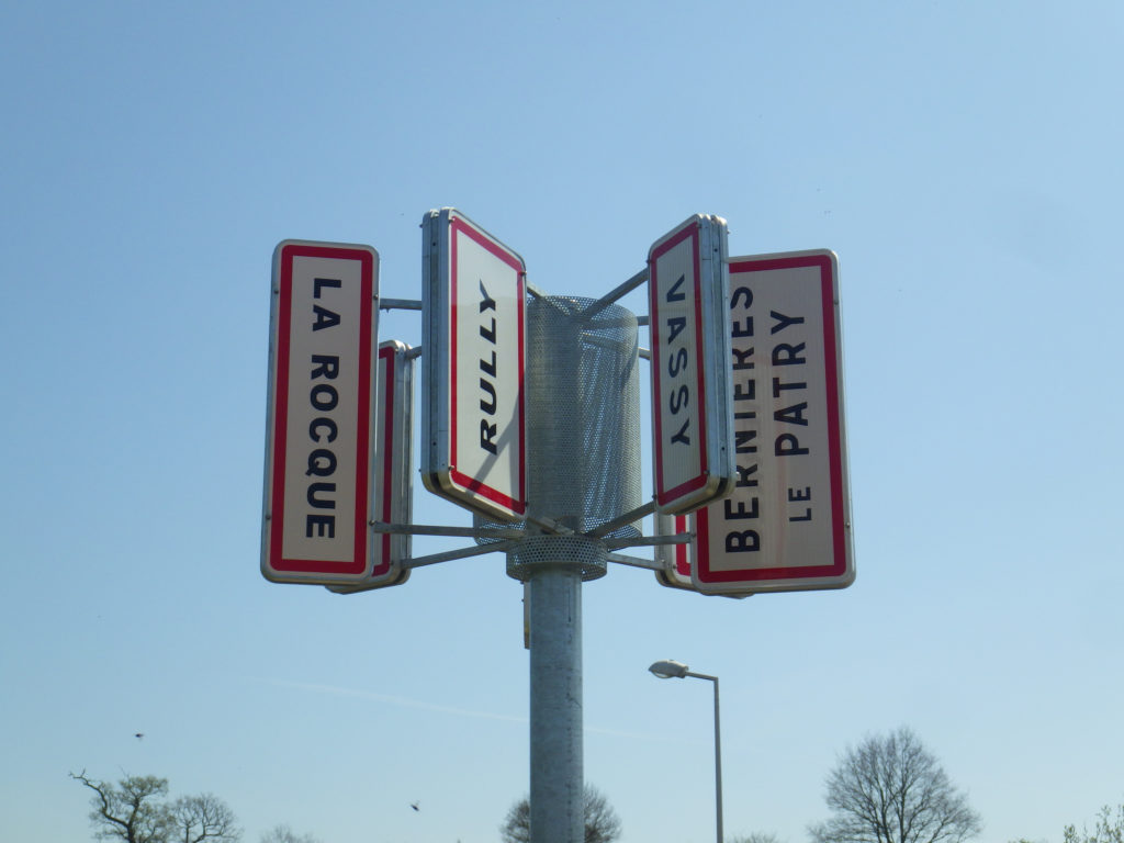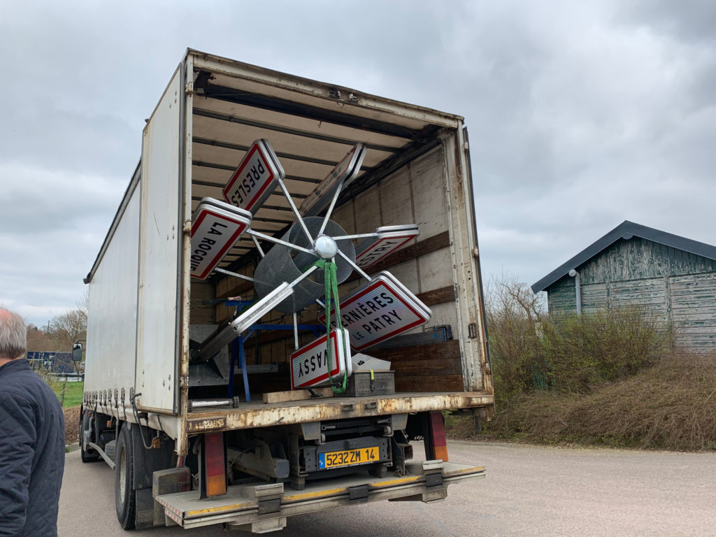 Symbole de la Commune Nouvelle de Valdallière, Denis VALLÉE, conseiller municipal de Valdallière a eu l’idée de récupérer les anciens panneaux d’entrée d’agglomération des 14 communes déléguées qui allaient être jetés, pour créer l’éolienne “VALDALLIÈRE”.