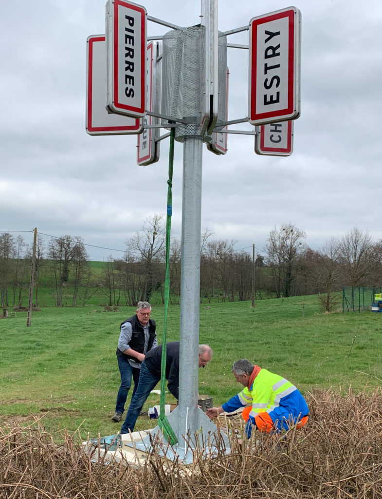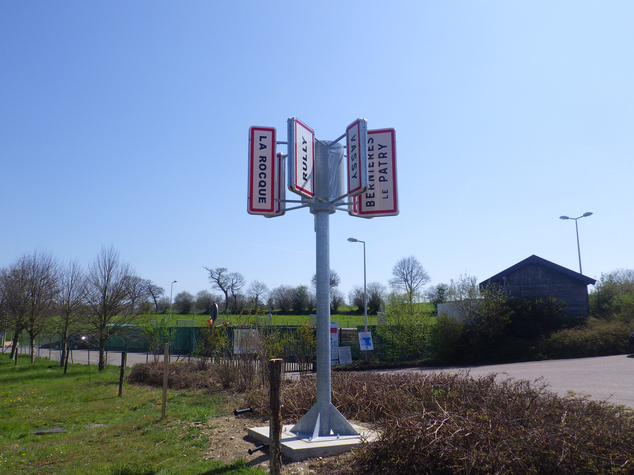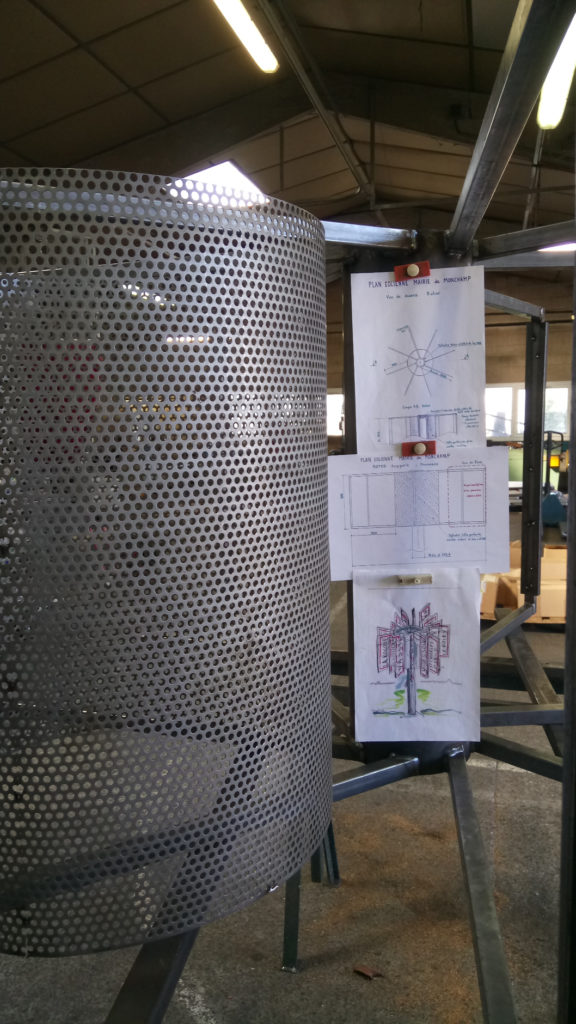Cette œuvre décorative unique, approuvée par le conseil municipal de Valdallière a été mise en chantier à l’ESAT de Roullours. Avec l’aide de bonnes volontés, l’éolienne terminée, a été implantée à côté de la déchetterie de PIERRES.