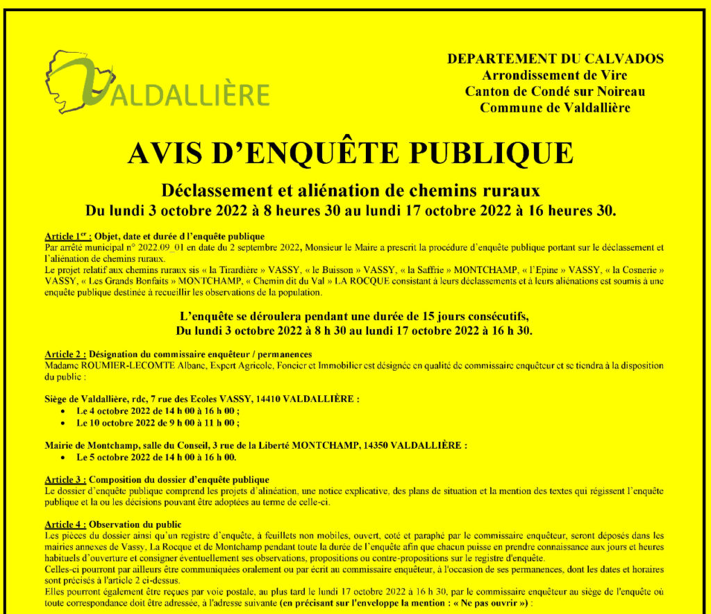 Par arrêté municipal n° 2022.09_01 en date du 2 septembre 2022, Monsieur le Maire a prescrit la procédure d’enquête publique portant sur le déclassement et l’aliénation de chemins ruraux.
