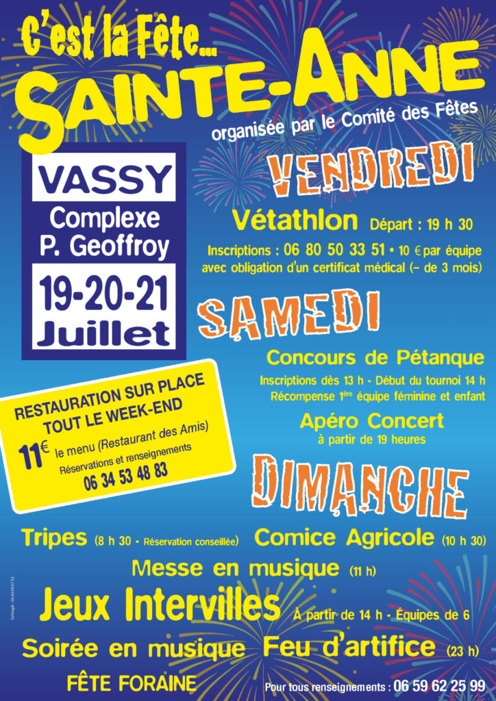 Le Comité des Fêtes de Vassy organise la traditionnelle fête Sainte Anne qui débutera le samedi 20 juillet 2019.