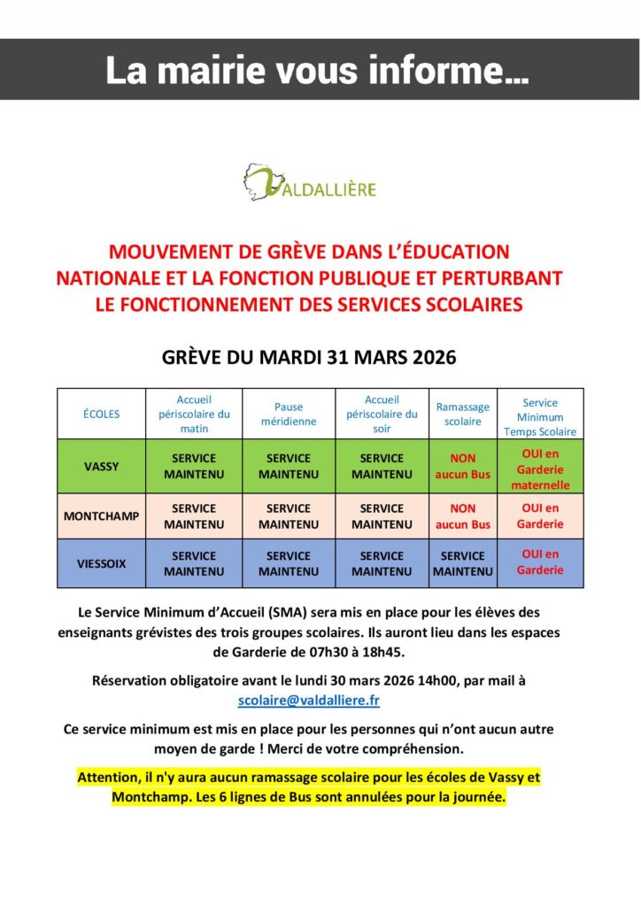 En raison d’un mouvement de grève national ce mardi 31 mars 2026, des perturbations sont annoncées pour les écoles municipales et les services périscolaires.