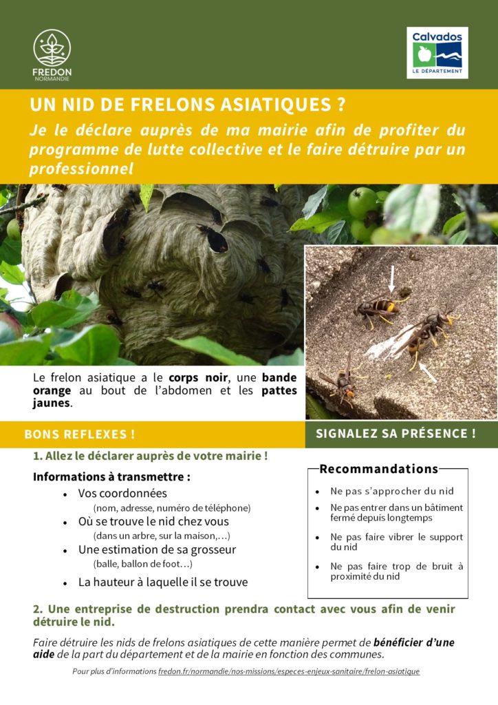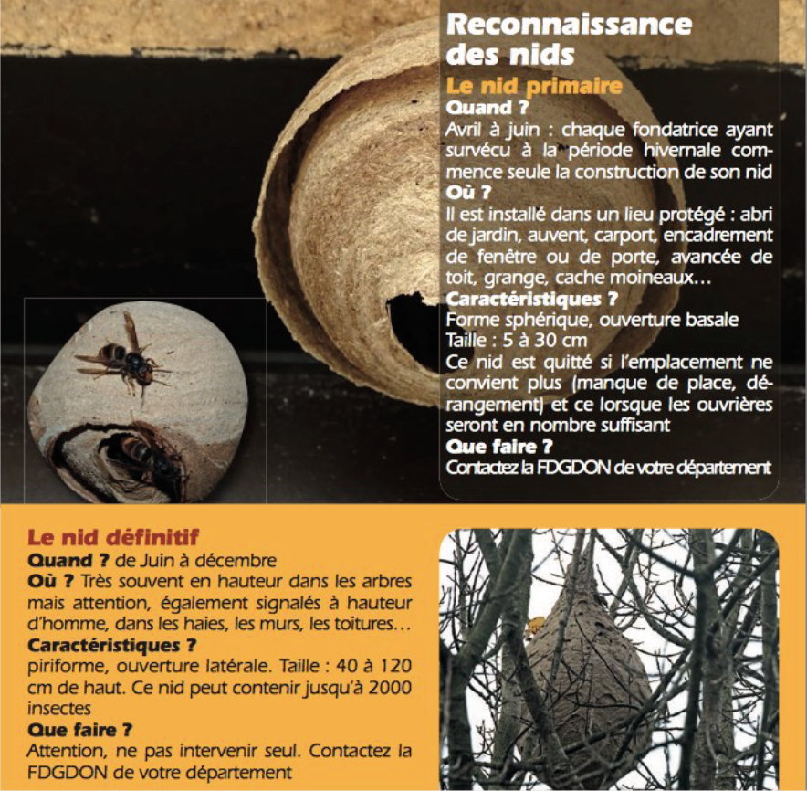 En cas de présence de frelons chez vous, recherchez le nid et si vous pensez reconnaître un nid de frelons asiatiques, contactez votre mairie.