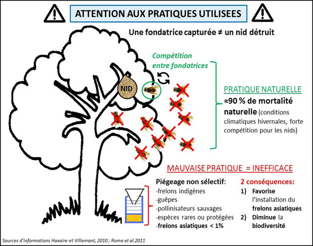Toutes les opérations de piégeage collectif faites dans les départements touchés avant nous ont montré leur incapacité à réduire le nombre de nids. Le taux de capture de fondatrices est extrêmement faible (1 à 2%). Il est très inférieur au taux de mortalité naturelle au printemps (95%).