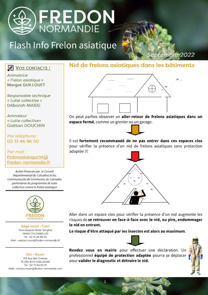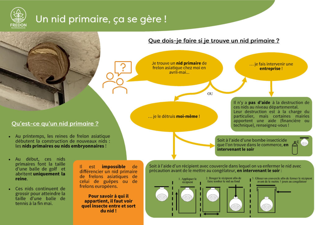 - La FREDON (Fédération Régionale de Destruction des Organismes Nuisibles) effectue la vérification qu’il s’agit bien d’un nid de frelons asiatiques (soit les informations renseignées sont suffisantes, soit la FREDON fait intervenir un référent, préalablement formé),