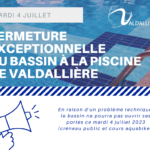 En raison d'un problème technique, le bassin ne pourra pas ouvrir ses portes ce mardi 4 juillet 2023 (créneau public et cours aquabike). Tout est mis en œuvre pour corriger le plus rapidement possible ce dysfonctionnement. Merci de votre compréhension. Contact : 02 31 09 05 94 ... Article publié le mardi 4 juillet 2023