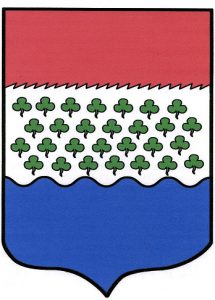 D’argent aux trèfles sans nombre, chargé d’un chef dentelé de gueules, et d’une fasce ondée d’azur posée en rivière.