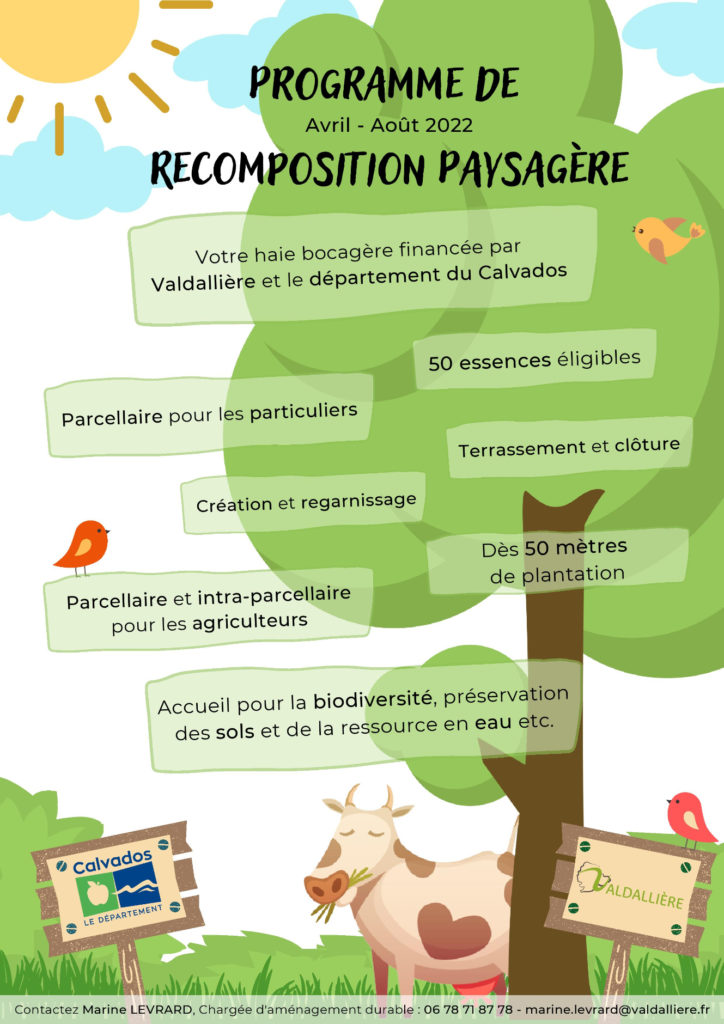 Ce programme, destiné aux particuliers et agriculteurs, est pris en charge totalement pour Valdallière et quasi totalement pour Terres de Druance (environ 70%). L’ouverture des dossiers peut se faire à partir de 50 plants, le terrassement est possible (problématique érosion ruissellement), et la clôture agricole est fournie si confrontation avec les troupeaux d’élevage…