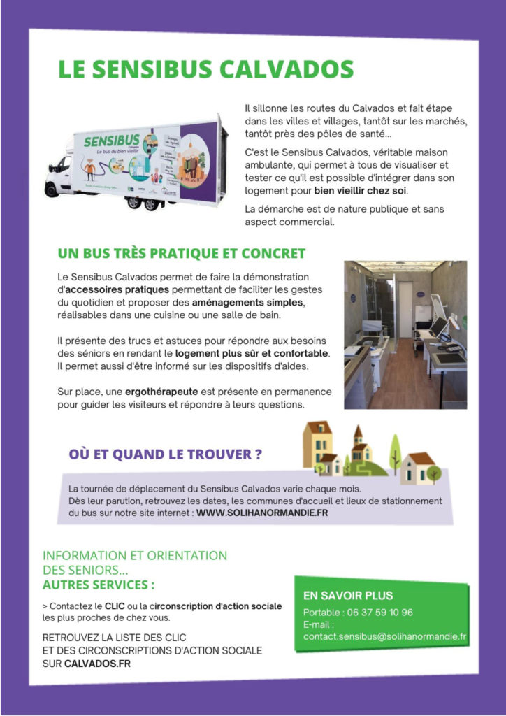 Le Sensibus Calvados, le bus du bien vieillir est un bus itinérant sur le département qui va à la rencontre des personnes de plus de 60 ans afin de leur exposer les dispositifs existants pour faciliter leur maintien à domicile.