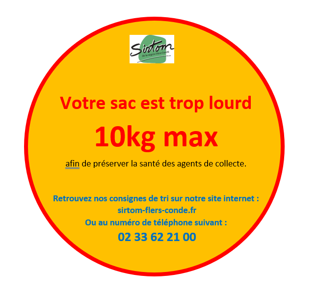 Nous vous rappelons que, conformément au droit du travail et pour la santé des équipiers de collecte, le poids des sacs est limité à 10 Kg au maximum.