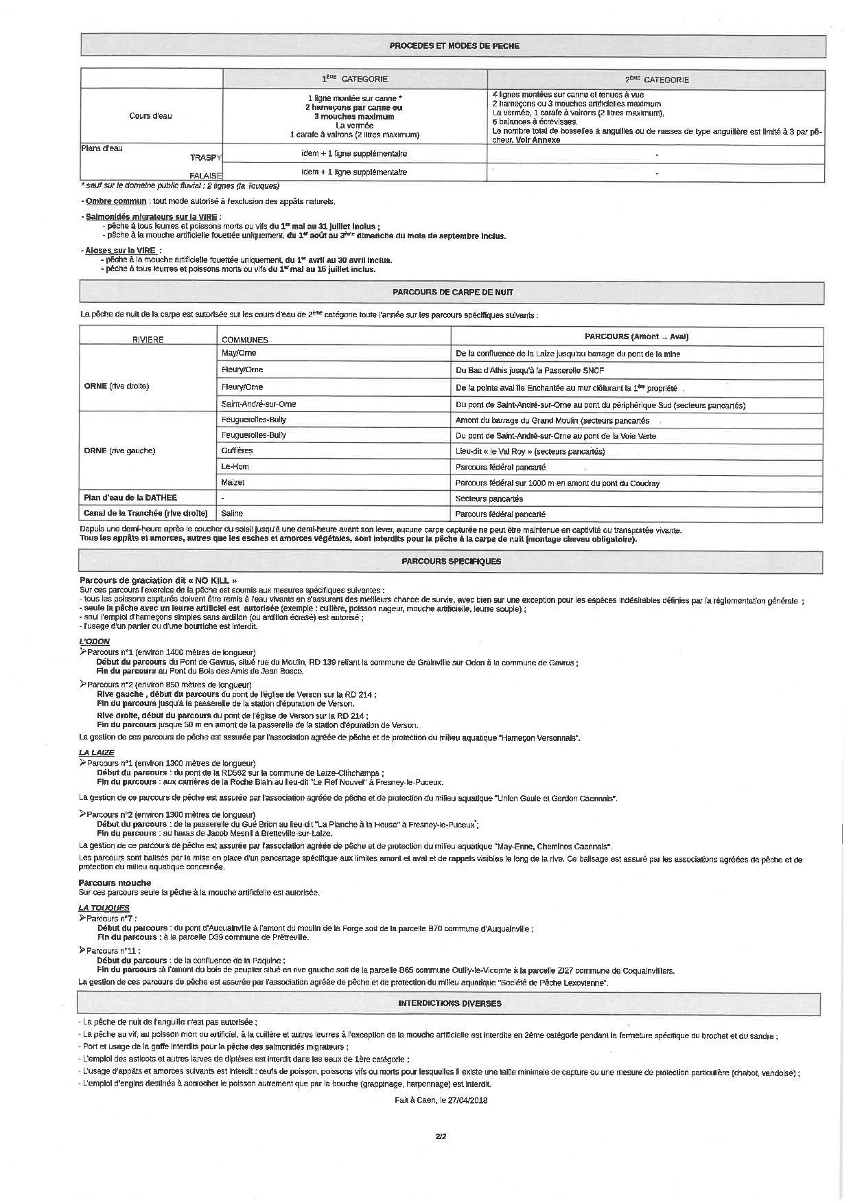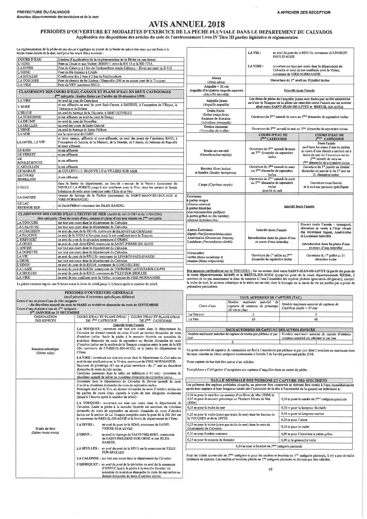 Arrêté préfectoral du 27 avril 2018 modifiant les dispositions de l’arrêté permanent du 7 mars 2016 modifié réglementant l’exercice de la pêche en eau douce dans le département du Calvados avec l’annexe 1, cliquez ICI