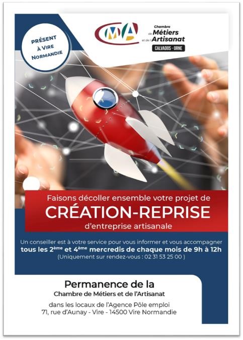 Pour mémoire, la Chambre de Commerce et d’Industrie Caen Normandie tient une permanence « Ici je monte ma boîte », également dans les locaux de Pôle Emploi à Vire Normandie, les mercredis de 9 h à 12 h 30 et de 14 h à 17 h, sur RV préalable pris au 07 84 55 98 35.