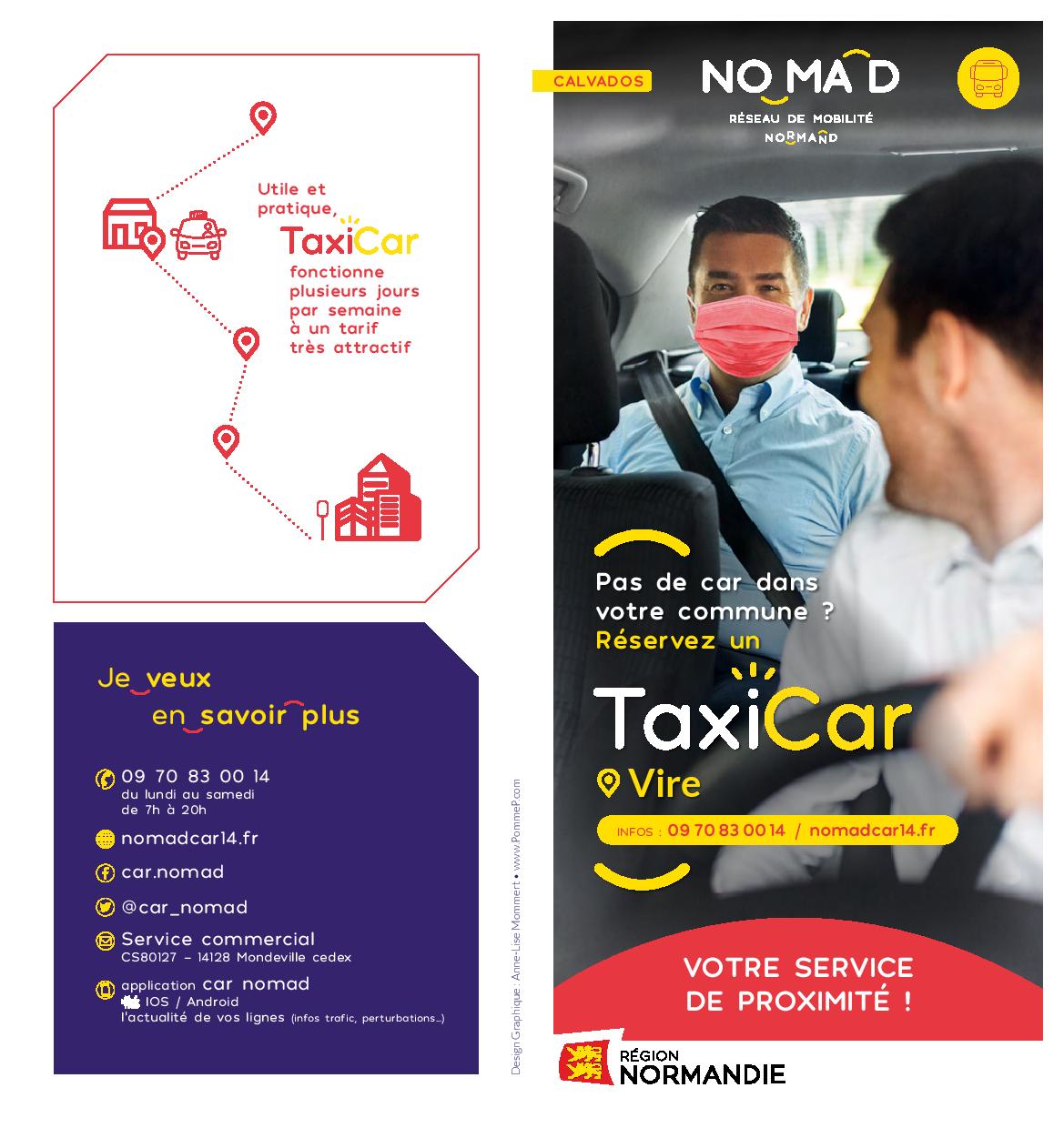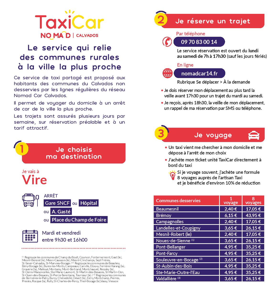 Le TaxiCar est un service de transport en commun sur réservation, complémentaire au réseau régional Nomad Calvados. Le service travaille en partenariat avec des artisans taxis qui viennent au domicile des voyageurs et les déposent à l’arrêt le plus proche du lieu de rendez-vous (Par exemple, à Vire, à la Gare SNCF, ou à l’Hôpital, ou rue Armand Gasté ou bien Place du Champ de Foire).