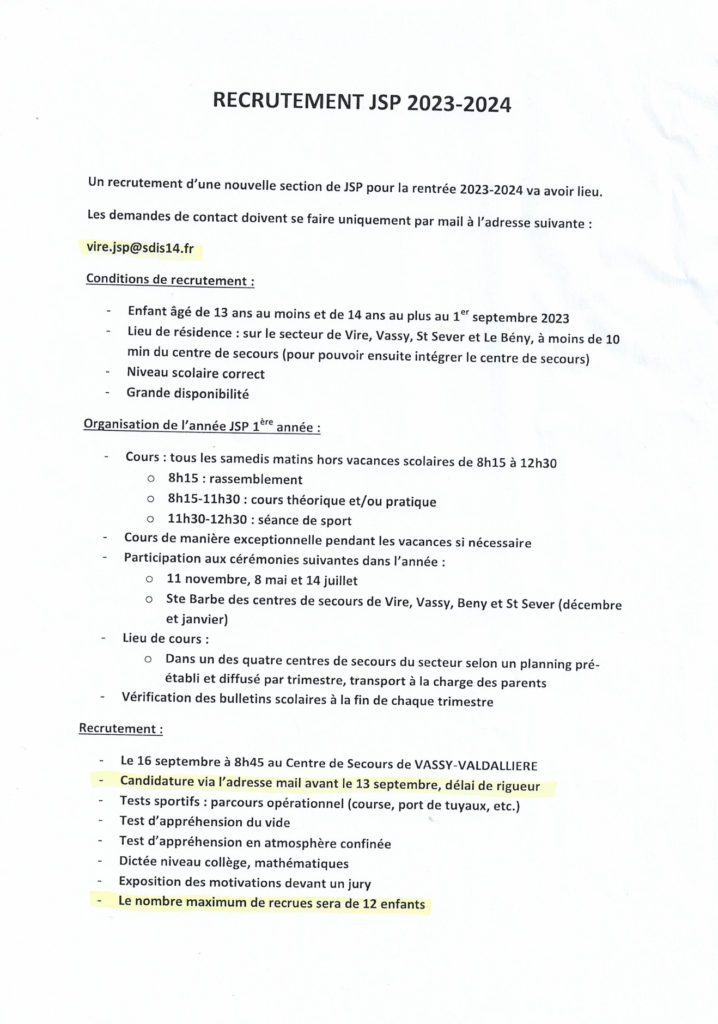 Un recrutement de nouveaux JSP (Jeunes Sapeurs Pompiers) pour la rentrée 2023-2024 va avoir lieu.