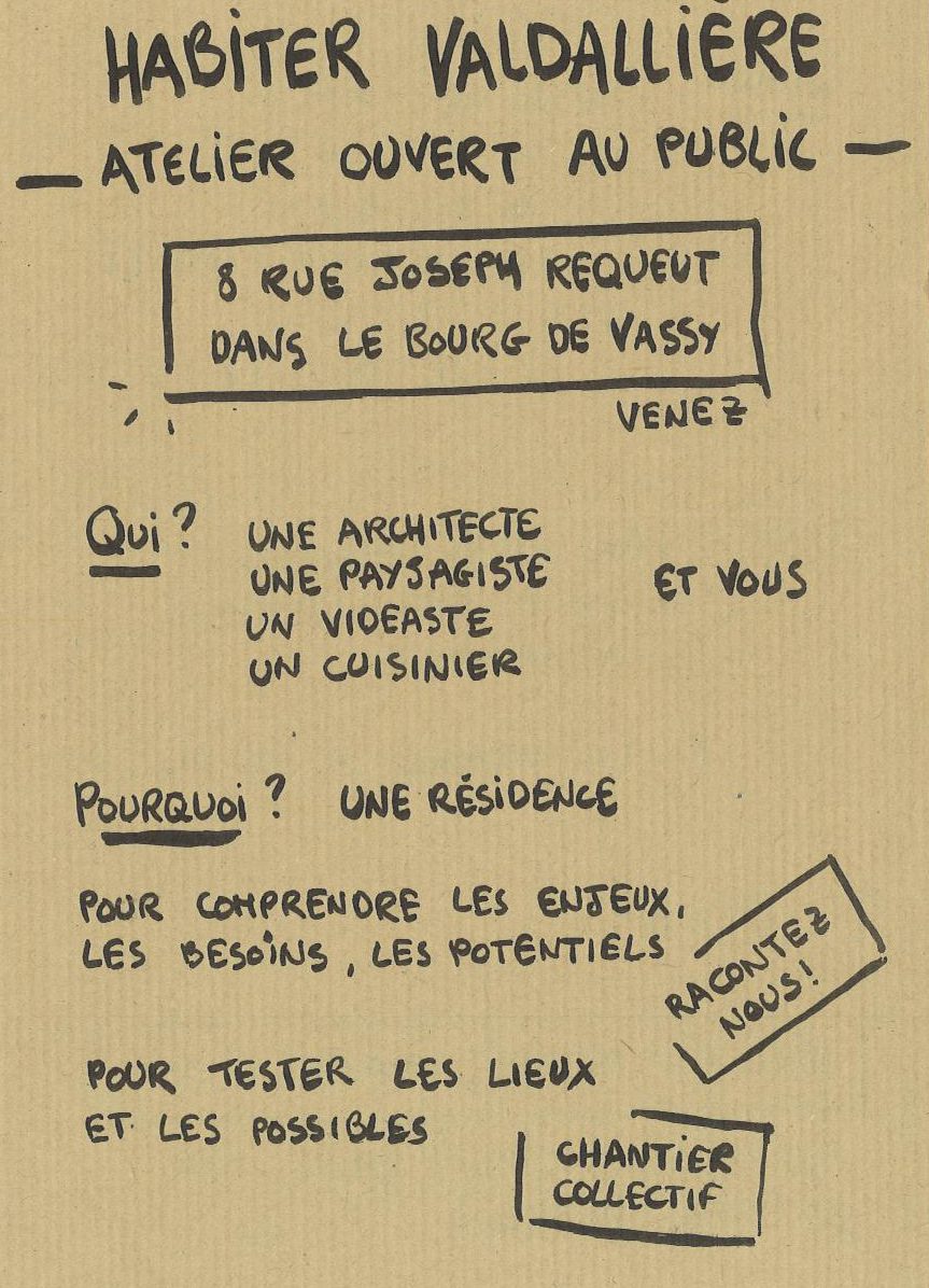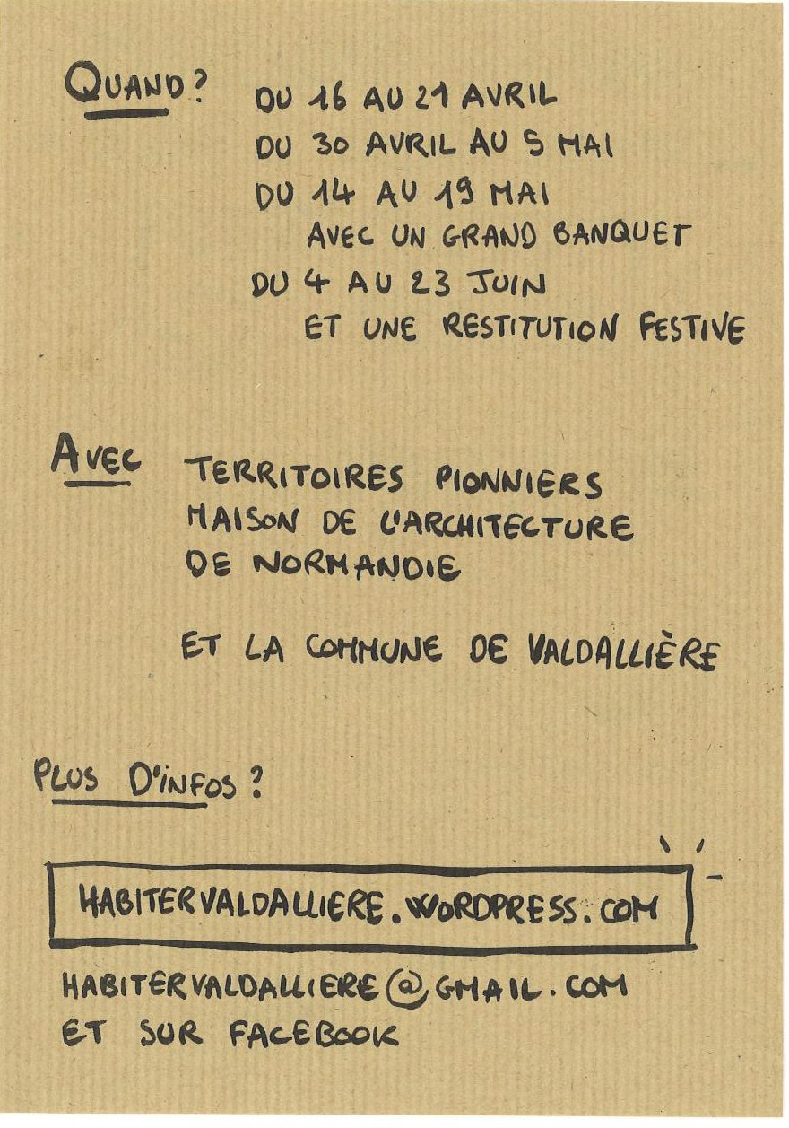 Après s’être rencontrées en Moselle, dans le cadre de l’Université foraine de Bataville*, entre chantier forestier et atelier ouvert d’architecture, elles arrivent en Normandie avec l’envie de mener une réflexion en actes avec et pour les habitants de la commune nouvelle de Valdallière. Leur binôme se positionne en tant qu’interface entre le lieu questionné et les acteurs qui gravitent autour (collectivités, institutions, habitants, usagers). Elles s’appuieront sur un atelier public, des rencontres, des actions, des maquettes et des expérimentations à l’échelle 1 pour comprendre, traduire et transmettre les enjeux et potentiels des lieux, créer les conditions d’une mise en débat et semer des graines de projets communs.”