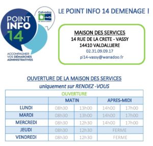 Le Point Info 14 de Vassy a été créé en 2001. Le Département a signifié son souhait d’adosser le réseau des Points Info 14 au schéma départemental d’accessibilité des services publics. Pour ce faire, le Conseil Départemental propose la labellisation des points Info 14 en « Maison des Services Publics ».