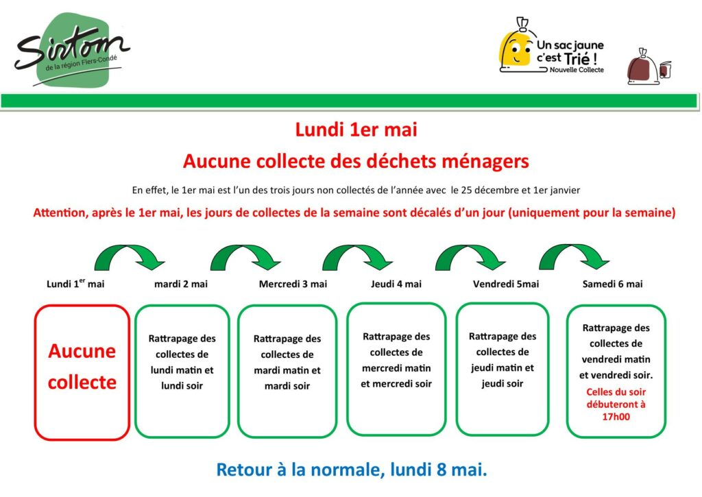 Le SIRTOM vous informe que les jours de collectes de la semaine sont décalés d’un jour à partir du 1er mai 2023 et pendant 1 semaine.