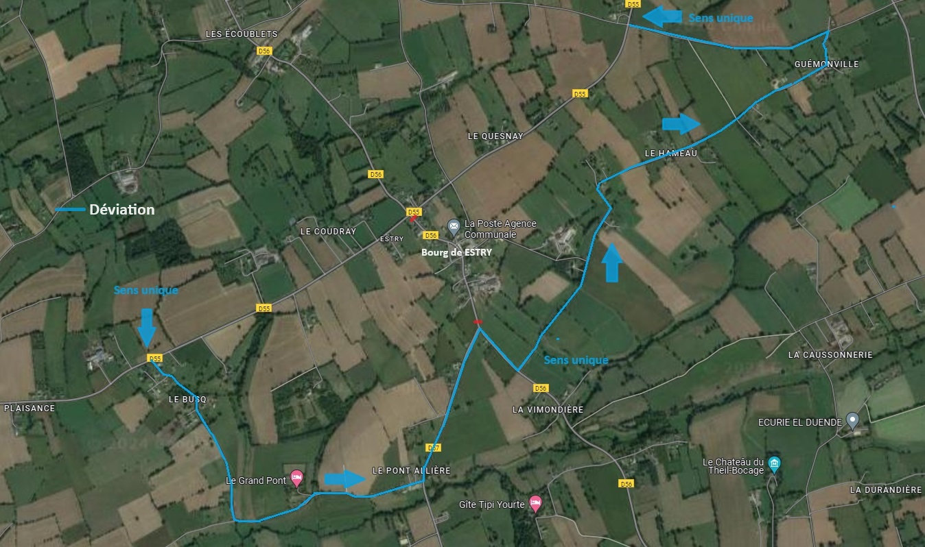 Une déviation en sens unique sera mise en place au carrefour de la D55 lieu dit « Le champ Morin » jusqu’à la D57 ainsi que du lieu dit « La Bouillerie » en direction du lieu dit « Le Manoir » jusqu’à « Guémonville ».