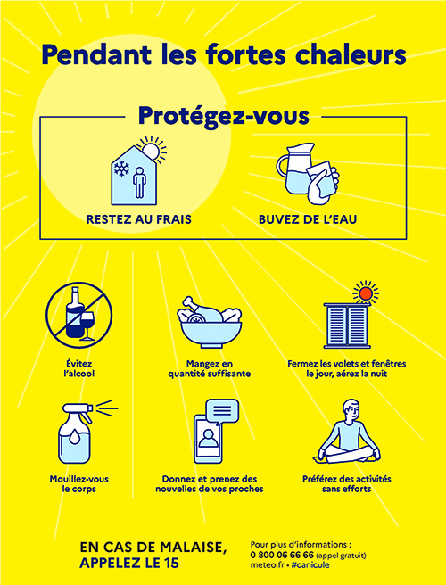 - évitez de sortir aux heures les plus chaudes et passez plusieurs heures par jour dans un lieu frais (cinéma, bibliothèque municipale, musée…) ;