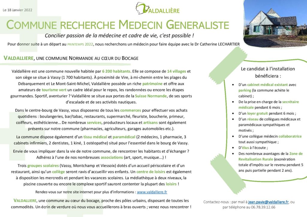 Valdallière, une commune au cœur du bocage normand où il fait bon vivre recherche un médecin …